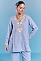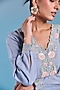 Kalista presents a powder blue top in cotton linen base shirt with a v-neckline, floral and lace embroidery. Elevate with pants, metallic heels, subtle gold accessories, and soft curls for effortless elegance, perfect for intimate gatherings, rakhi celebrations, or low-key festive evenings.