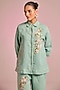 Kalista presents a seafoam green shirt in cotton linen base with piping detail, thread and sequins floral embroidery. Elevate with pants, metallic heels, subtle gold accessories, and soft curls for effortless elegance, perfect for intimate gatherings, rakhi celebrations, or low-key festive evenings.