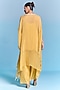 Kalista presents a sunflower yellow kaftan in organza base with thread, sequins and moti hand embroidery. It is paired with an inner and viscose pants. Elevate with metallic heels, subtle gold accessories, and soft curls for effortless grace, perfect for intimate get-togethers, rakhi celebrations, or low-key festive evenings.