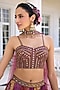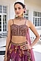 Kalista features a tyrian purple lehenga in organza base with floral print. It is paired with a dola silk corset blouse having embroidery and a butterfly net dupatta. Style it with statement chandbalis, soft curls, and embellished heels for a glam-yet-traditional sangeet or engagement look.