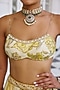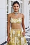 Kalista features a yellow skirt in organza base with a floral print. It is paired with an organza bustier and a butterfly net flowy cape. Ideal for a sangeet, haldi or engagement ceremonies, where modern glamour meets Indian elegance.