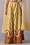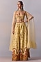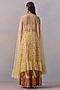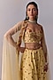 Kalista features a yellow cape in net base. It is paired with a viscose silk embroidered corset blouse, including viscose silk sharara pants having sequins and thread hand embroidery. Accentuate with statement jewellery and heels for a festive occasion or haldi ceremony.