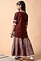Featuring a maroon kurta in cotton base with crochet lace embroidery. It is paired with matching sharara pants and a block-printed dupatta having handmade tassels.