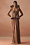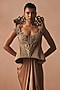 Featuring a gold top in cotton base with embroidery. It is paired with a satin skirt. Accentuate it with statement earrings and heels for a cocktail party, engagement or sangeet ceremony.