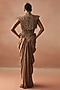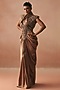 Featuring a gold gown in satin and cotton base. It is paired with an embroidered shirt jacket. Accentuate it with dainty jewellery and strappy heels for cocktail parties, garden weddings or festive brunches.