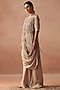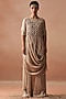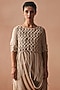 Featuring an ivory tunic in satin base with embroidery. It is paired with a zari bib and flared pants. Accentuate with statement earrings, block heels, and a sleek clutch for an effortlessly chic look, perfect for a festive occasion or a casual day out.