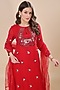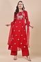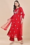 Featuring a red kurta in georgette base with hand embroidery. It is paired with raw silk pants and a net dupatta. Elevate the look with statement earrings and light makeup, perfect for a festive occasion or rakhi gathering.