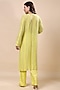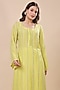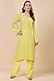 Featuring a yellow kurta in tissue base with hand embroidery. It is paired with opada silk pants. Elevate the look with statement earrings and light makeup, perfect for a festive occasion, haldi or rakhi gathering.