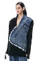 Featuring a black single-breasted blazer in polyester and cotton base with denim panel detailing. Accentuate it with pants, hoop earrings and high-boots for semi-formal events.