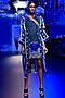 Featuring a blue sleeveless dress in denim base with mesh and lace detailing.