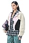 Featuring a multi-colored jacket in polyester base with color blocking and zip front detail. Accentuate it with pants, hoop earrings and boots for high-end street style look.