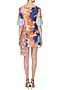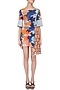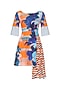 Featuring an orange and blue flared short dress in polyester crepe base with floral lily print all over and block grid printed side panel.