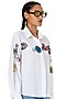 Featuring a white shirt in cotton base with gathered sleeves and floral applique embroidery. This contains only one piece.
