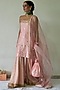 Featuring a pink kurta in pure dupion base with zari hand embroidery. It is paired with matching georgette leheriya gharara pants and an organza dupatta. Accentuate it with dangler earrings and heels for a festive occasion or an engagement ceremony.