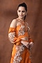 Featuring an orange halter blouse in bemberg silk base with off-shoulder sleeves and muskaish gold embroidery. It is paired with embroidered flared pants. Accentuate it with metallic heels and statement earrings, perfect for a sangeet, cocktail night or modern festive celebration.