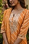 Featuring a mustard kurta in chanderi base with digital leheriya print and gota patti embroidery. It is paired with matching cotton pants and a dupatta.