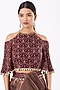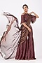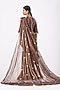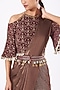 Featuring a brown cold-shoulder blouse in georgette base with bell sleeves. It is paired with matching chinon silk palazzo pants, an attached organza tissue drape having leather motifs, and a belt having embroidery.