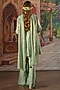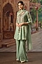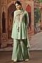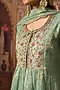 Featuring an aqua gathered kurta in handwoven tissue silk base with thread, zari, and sequins hand embroidery. It is paired with matching bell pants and a dupatta.
