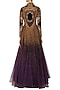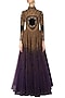 Featuring a charocal grey and gold shaded fit and flared armour louvre tool gown in net base with velvet insert on the bodice highlighted with gold beads and thread embroidery all over. It has floral thread applique work motifs all over the flared ghera.