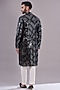 Featuring a black kurta in georgette base with mirror, sequins and thread work. It is paired with contrasting white pants. Perfect wear for an engagement or sangeet occasions.