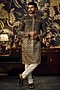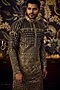 Featuring a black kurta in georgette base with antique gold thread and sequins embroidery. Perfect attire for any festive occasion, exuding traditional charm and timeless elegance.