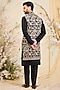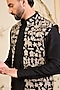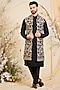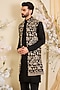 Featuring a black long open-jacket in georgette base with sequins and zari work. Style it with a kurta set and mojaris for a wedding, sangeet or engagement ceremony.