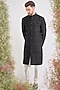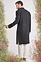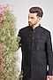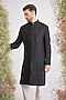 Featuring a black sherwani in silk base, adorned with metal buttons, and thread work. Accentuate it with straight pants or churidar, and pair of mojaris for a wedding, sangeet or engagement ceremony.