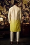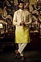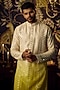 Featuring a cream-yellow kurta in silk base with mirror work. It is paired with white pants. Perfect attire for any festive occasion, wedding or engagement ceremony, exuding charm and elegance.