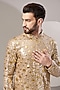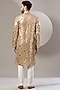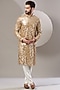 Featuring a gold kurta in georgette base with sequins embroidery. It is paired with contrasting white pants. Perfect wear for sangeet or weddings ceremony.