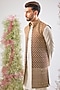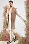Featuring a gold open jacket in georgette base with zari and sequins embroidery. Accentuate it with a kurta set, pair of loafers and a bracelet for festive celebrations or sangeet ceremony.