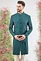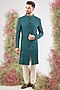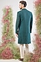 Featuring a green sherwani in silk base adorned with thread work, cutdana, and metal buttons. Accentuate it with straight pants or churidar, and pair of mojaris for a wedding, sangeet or engagement ceremony.