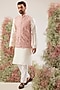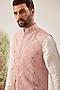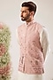 Featuring a peach nehru jacket in georgette base with patch work and peacock motif detail. Accentuate it with a kurta set, a pair of mojaris and a watch for a festive occasion or sangeet ceremony.