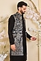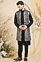 Featuring a regal blue long open-jacket in silk base with zari and sequins work. Style it with a kurta set and mojaris for a wedding, sangeet or engagement ceremony.