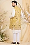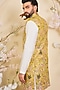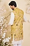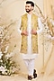 Featuring a yellow long open-jacket in georgette base with sequins work. Style it with a kurta set and mojaris for a wedding, sangeet or engagement ceremony.