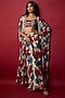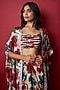 Featuring an ivory cape in crepe silk base with digital print and dori lace detail. It is paired with a bustier and a skirt. Accentuate with statement jewellery and heels for a cocktail party or sangeet ceremony.