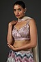 Featuring a multi-colored chevron lehenga in organza base with thread and gota work. It is paired with a matching blouse and a net dupatta.