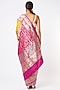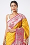 Featuring a yellow and pink saree in pure handloom banarasi silk base with zari work. It is paired with an unstitched blouse. Accentuate it with statement jewellery and heels for a festive occasion, haldi or pooja ceremony.