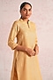 Featuring a cashew-colored kurta in linen blend base with a structured mandarin collar and organza cuff detail, including pearl and sequins embroidery. It is paired with straight pants and a dupatta. Accentuate it with dangler earrings and flats for casual outings or family gatherings.