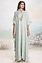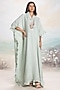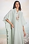 Featuring a cloud colored kaftan in linen base with a v-roll collar and ruffle hem, adorned with floral thread embossed embroidery. Style it with jewellery, block heels and a sleek hairdo for a complete look. Perfect for occasion and party wear.