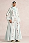 Featuring an ice blue abaya jacket in linen blend base with a notch collar, floral print, bead work and silk thread embroidery, including lace trims, dori tie-up and tassel detailing. It is paired with a dress. Accentuate it with statement earrings, block heels and a clutch for a refined look, perfect for festive evenings, formal dinners or elegant gatherings.