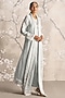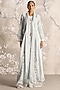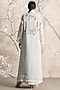 Featuring an ice abaya jacket in linen blend and silk organza base with silk thread hand embroidery, rose bud hand made tassels, hand twisted cords and pearl lace. It is paired with a dress. Style it with jewellery, block heels and a clutch for a complete look, perfect for occasional wear, party wear and easy daily wear.