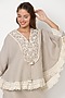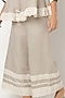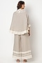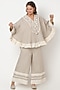Featuring a natural beige ruffled top in linen base with floral thread embroidery, crochet lace work, and a tie-up. It is paired with matching flared pants.