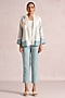 Featuring an off-white and blueberry jacket in linen blend base with print and striped shawl collar. It is paired with blueberry straight pants. Accentuate it with hoop earrings and flats for casual outings, office wear or brunches.
