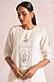 Featuring an off-white kurta in linen blend base with print and embroidery. It is paired with pants and a dupatta. Accentuate it with dangler earrings and flats for casual outings or family gatherings.