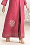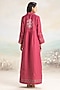 Featuring a pomegranate colored abaya jacket in linen base with a round neckline, crochet lace detailing, cotton thread floral embroidery and hand screen print. It is paired with a dress. Accentuate it with statement earrings, block heels and a clutch for a refined look, perfect for festive evenings, formal dinners or elegant gatherings.