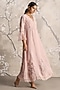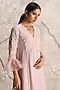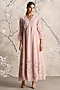 Featuring a shadow rose dress in linen blend and silk organza base with a V-neckline, multi-colored floral hand embroidery, gathered lace, pearl and hand smocking detail. Accentuate it with statement earrings, block heels and a clutch for a refined look, perfect for garden parties, daytime events or brunch dates.