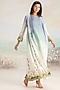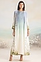 Featuring a sunset blue tie-dye abaya jacket in linen base with print and floral thread embossed embroidery. It is paired with a round-neck inner dress. Style it with jewellery, block heels and a clutch for a complete look, perfect for occasional wear, party wear and easy daily wear.