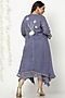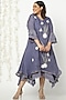 Featuring a twilight blue asymmetrical dress in linen base with layers, leaf print, and thread applique embroidery, including crochet lace detailings.