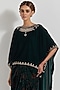 Featuring a bottle green high-low cape in velvet base with hand embellishments. It is paired with a cowl skirt having hand block print. Accentuate it with statement earrings and heels for a festive occasion.