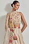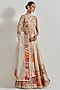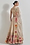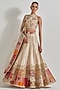 Featuring an ivory lehenga in brocade, organza and cotton lycra base with patchwork. It is paired with a blouse and a dupatta. Accentuate it with statement jewellery and heels for festive occasions or wedding ceremonies.